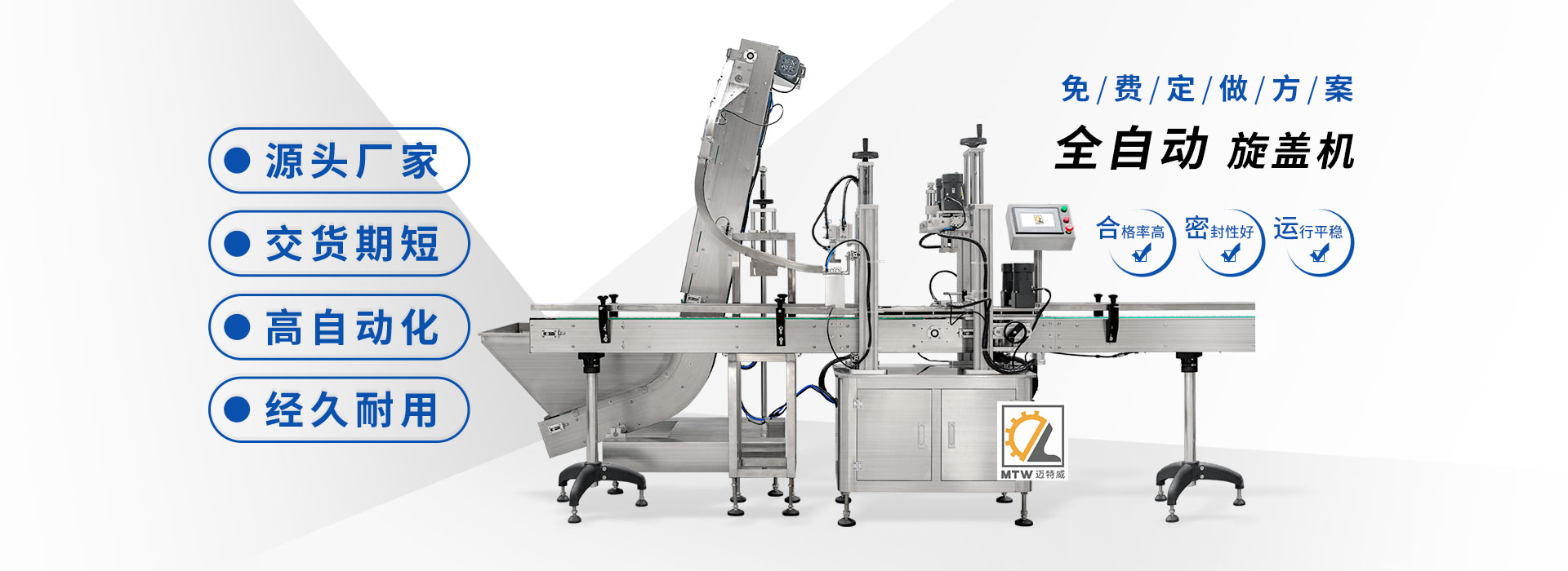 邁特威自動化設(shè)備(天津)有限公司坐落于素有京津明珠之稱的天津·武清區(qū),是國家高新技術(shù)企業(yè),專注生產(chǎn)、研發(fā)、銷售全自動灌裝機(jī)、旋蓋機(jī)、封口機(jī)、貼標(biāo)機(jī)等系列產(chǎn)品,立足京津冀、服務(wù)全國,遠(yuǎn)銷海內(nèi)外,團(tuán)隊由行業(yè)高技術(shù)人士組成,為國內(nèi)外食品、日化、糧油、醫(yī)藥等企業(yè)提供滿意的包裝解決方案。 查看詳情